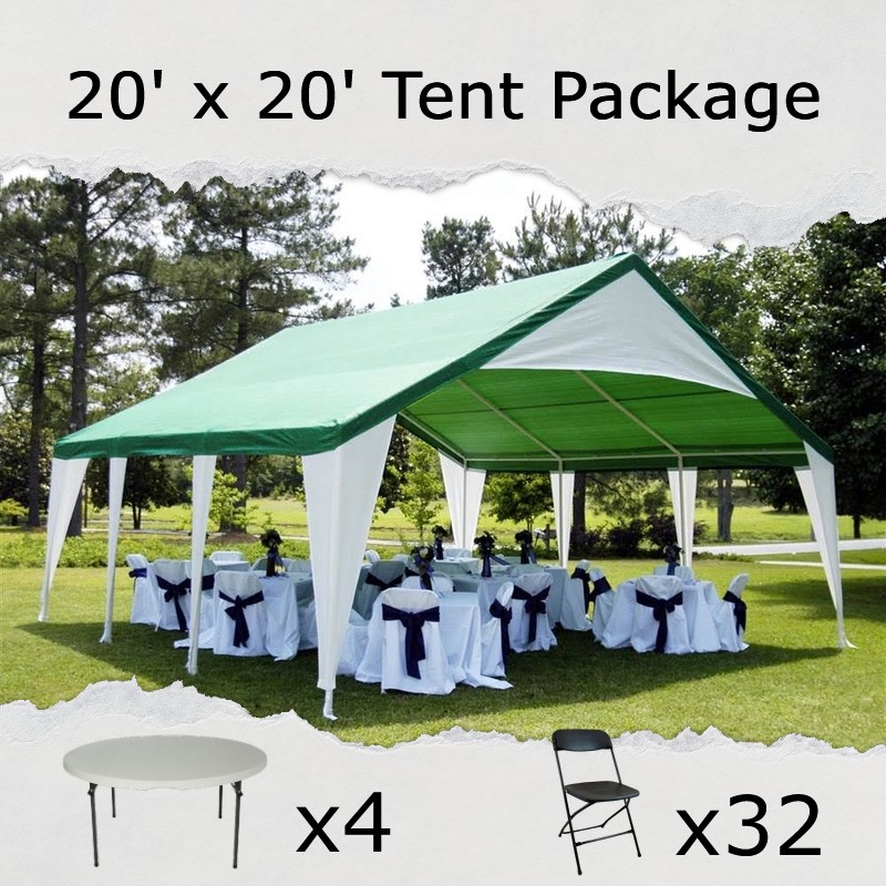 This 20 foot by 20 foot green and white frame tent is perfect for parties and outdoor events up to 48 guests. This tent package includes 4 five-foot round tables and 32 chairs. By renting a frame tent, there will be no center pole in the middle of the tent. Sidewalls are included with this tent.